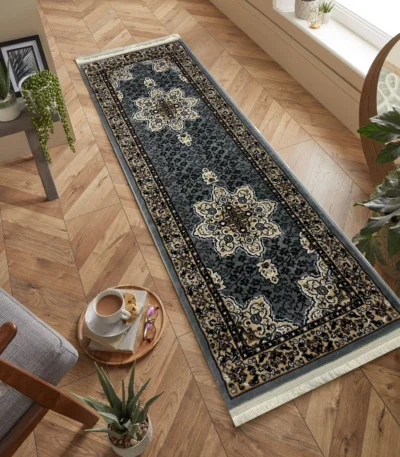 Elegant runner carpet perfect for hallways and narrow spaces. Features grey color. Pakistani